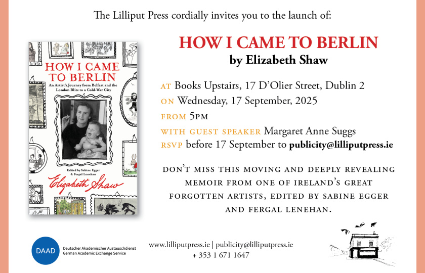 The Lilliput Press will launch "How I Came To Berlin: An Artist’s Journey from Belfast and the London Blitz to a Cold-War City" by Elizabeth Shaw, edited by Sabine Egger and Fergal Lenehan, at Books Upstairs, near Trinity College Dublin on Wednesday, 17 September at 5pm.